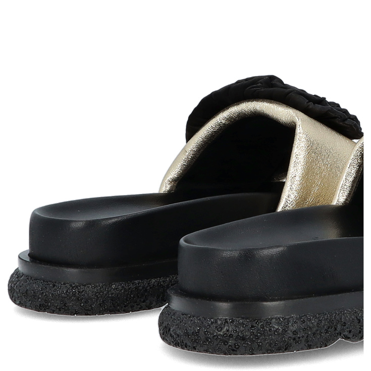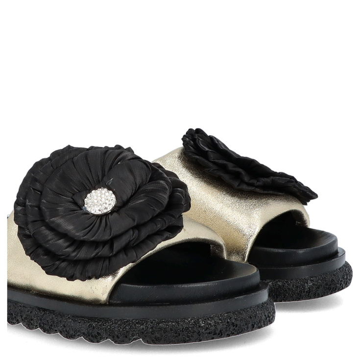 Ozdobny kwiat wykonany z tkaniny z błyszczącym środkiem w formie kryształków dodaje butom biżuteryjnego wykończenia, a kontrast między złotą cholewką a czarną podeszwą i aplikacją sprawia, że model wyróżnia się na tle klasycznych klapek.