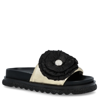 Ozdobny kwiat wykonany z tkaniny z błyszczącym środkiem w formie kryształków dodaje butom biżuteryjnego wykończenia, a kontrast między złotą cholewką a czarną podeszwą i aplikacją sprawia, że model wyróżnia się na tle klasycznych klapek.
