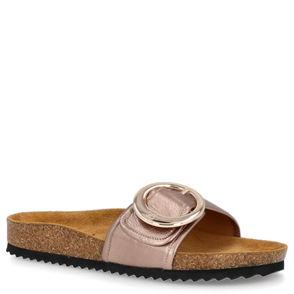 Caprice 9-27401-44 to klapki, które doskonale łączą wygodę codziennego obuwia z modnym, metalicznym wykończeniem. Wykonane z wysokiej jakości skóry i osadzone na lekkiej, korkowej podeszwie, stanowią idealne uzupełnienie letnich stylizacji. Ich złoty kolor z efektem różowego metalu dodaje nowoczesnego, kobiecego charakteru.