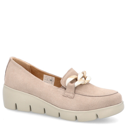 Uniwersalne mokasyny zostały wykonane z najwyższej jakości skóry naturalnej nubukowej w głębokim beżowym kolorze. Posiadają 5- centymetrową platformę, która ma za zadanie optycznie wysmuklić nam sylwetkę oraz dodać nam kilku centymetrów do wzrostu. Wkładka wykonana również z naturalnej skóry zapewnia odpowiednią cyrkulacje powietrza oraz chroni przed wilgocią. Klasyczny wygląd buta odmienia ozdobny beżowy łańcuszek na przodzie cholewki.