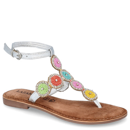 Uwielbiasz niebanalne wzornictwo, a jakość wykonania jest dla Ciebie priorytetem? Jeśli tak, to z pewnością Twoją uwagę przyciągną te nietuzinkowe sandałki damskie od holenderskiej marki LAZAMANI! Model ten jest bogato zdobiony kryształkami i kolorowymi koralikami. Skórzane paski są dodatkowo wzmocnione metalicznym wykończeniem, co nadaje im wyjątkowo modny wygląd. Ten stylowy zestaw można łatwo połączyć z różnymi letnimi stylizacjami. Miękko wyściełana wkładka jest wyłożona zamszem, co zapewnia wygodę noszenia. Pasek na kostce można regulować za pomocą klamry, aby uzyskać pożądane dopasowanie i wsparcie, dzięki czemu te sandały są nie tylko modne, ale także praktyczne i wygodne na różne letnie okazje. Gumowa podeszwa zewnętrzna zapewnia przyczepność i stabilność.