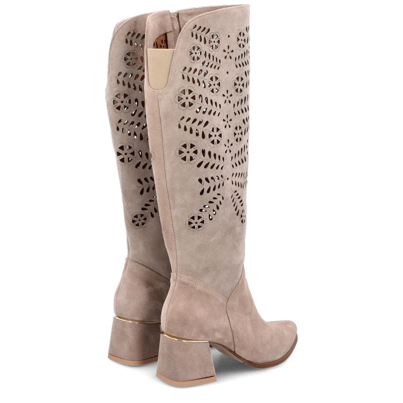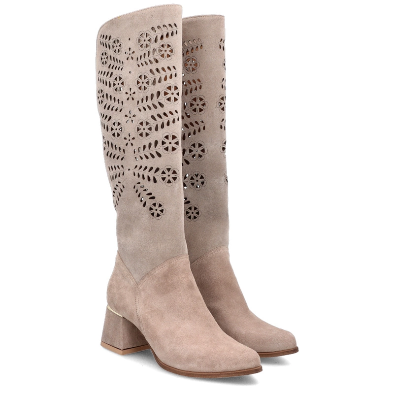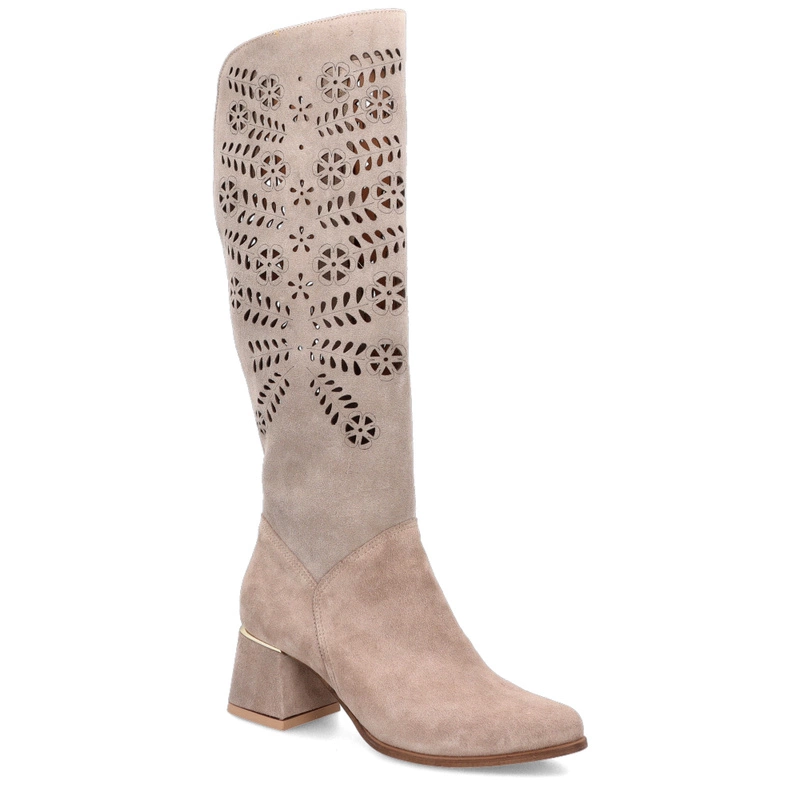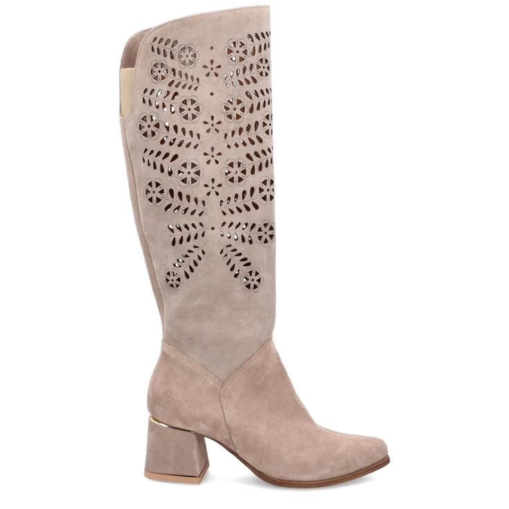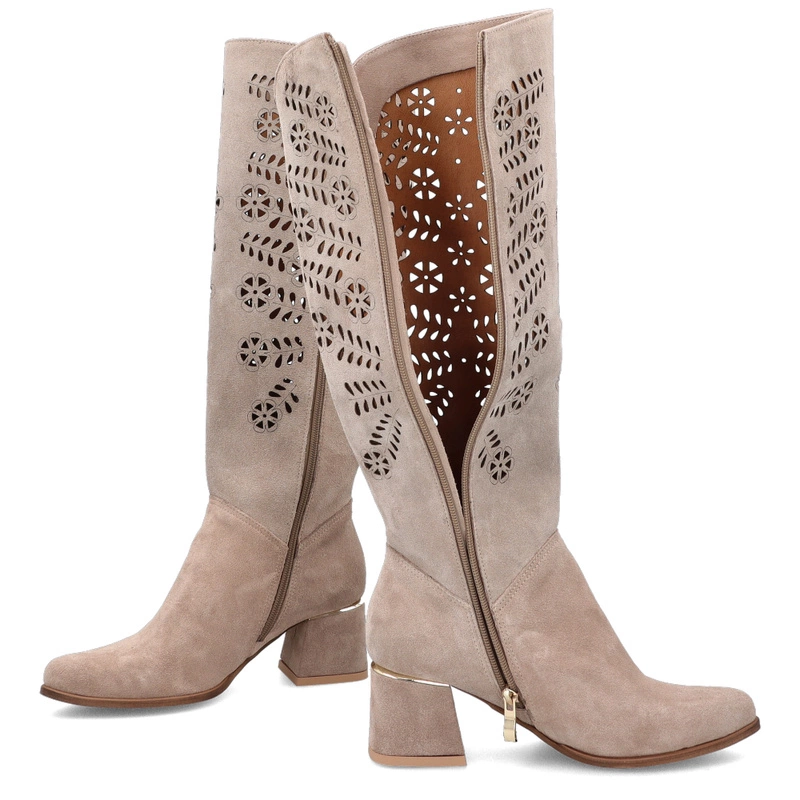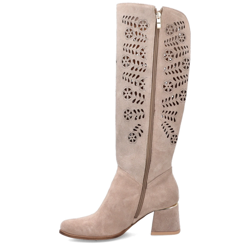 Stylowe ażurowe kozaki. Efektowne długie kozaczki wykonane z miękkiego zamszu w neutralnym odcieniu beżu. Stylowe, całoroczne kozaki będą idealne do zwiewnych sukienek i dżinsowych szortów, dodadzą stylizacjom swobodnego szyku. Cholewka butów nie jest ocieplana, ażurowe wycięcia zapewniają dobrą cyrkulację powietrza, guma w górnej części cholewki pozwoli na dobre dopasowanie do nogi, od wewnętrznej strony umieszczono suwak, który ułatwi założenie butów. Nasze kozaki wyróżnia zgrabny wygląd- szpiczasty nosek dodaje nogom smukłości, stabilny obcas o optymalnej wysokości 6 cm to gwarancja wygody a jednocześnie dodatkowe kilka centymetrów wzrostu, wzrok przyciąga błyszczący detal umieszczony przy nasadzie obcasa. Buty zostały wykonane przez polskiego producenta, z zastosowaniem najwyższej jakości materiałów, wyróżniają się ciekawym wzornictwem, szczególnie polecamy odważnym kobietom, śmiało podążającym za modą.