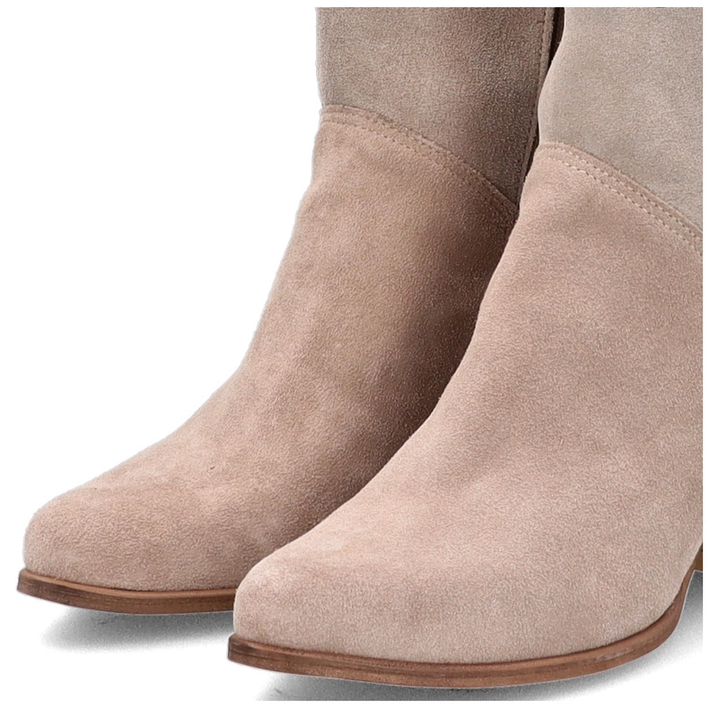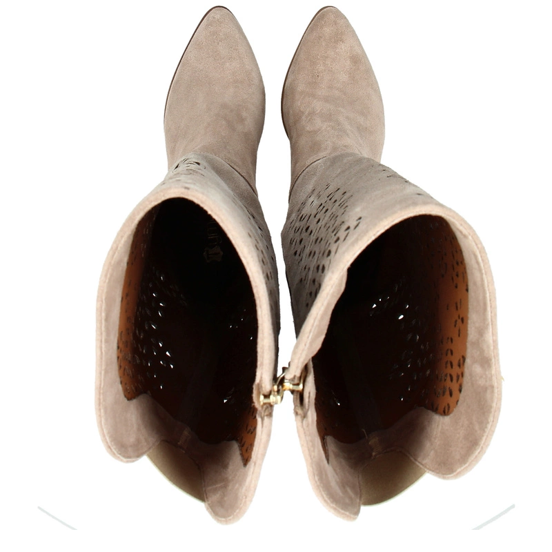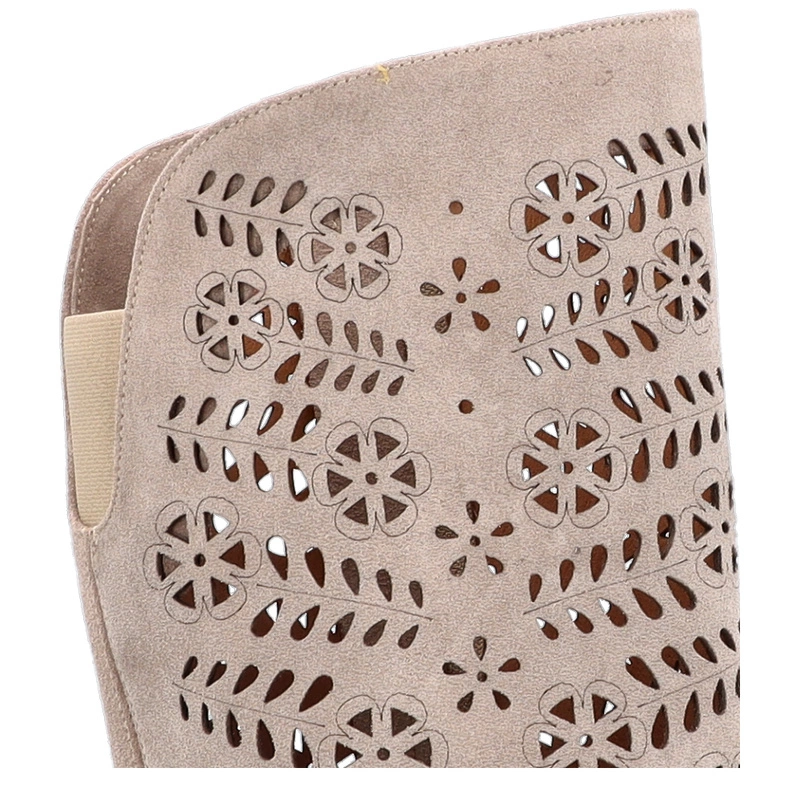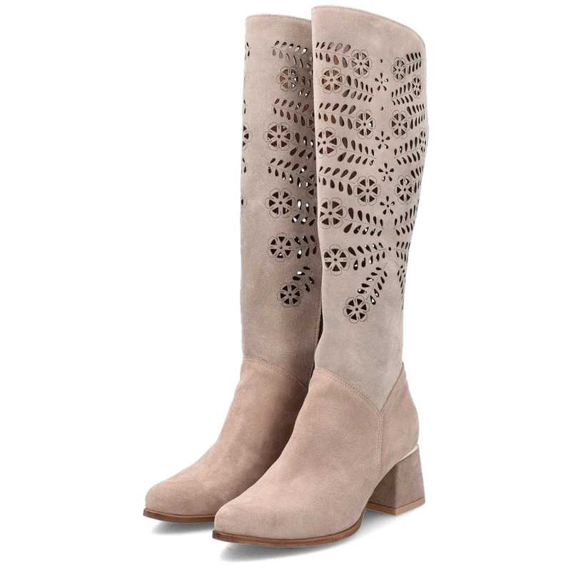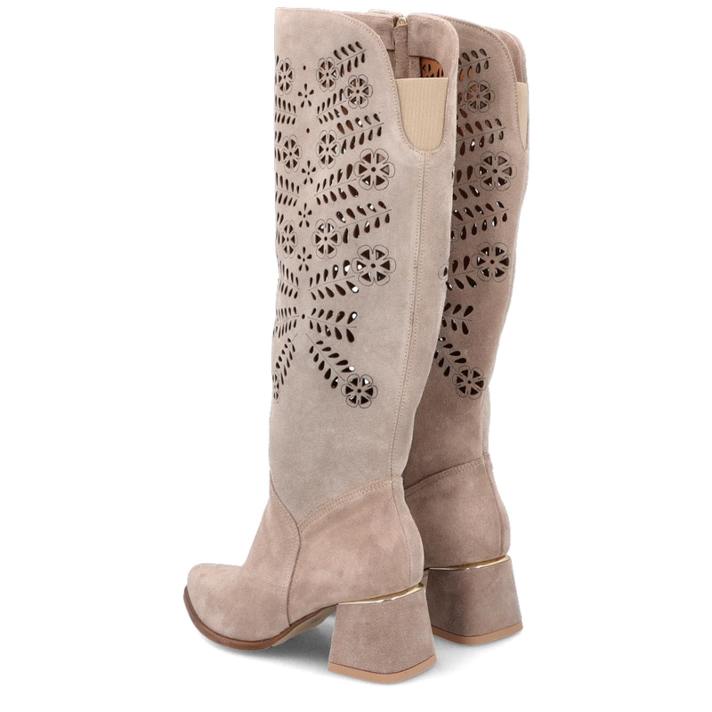 Stylowe ażurowe kozaki. Efektowne długie kozaczki wykonane z miękkiego zamszu w neutralnym odcieniu beżu. Stylowe, całoroczne kozaki będą idealne do zwiewnych sukienek i dżinsowych szortów, dodadzą stylizacjom swobodnego szyku. Cholewka butów nie jest ocieplana, ażurowe wycięcia zapewniają dobrą cyrkulację powietrza, guma w górnej części cholewki pozwoli na dobre dopasowanie do nogi, od wewnętrznej strony umieszczono suwak, który ułatwi założenie butów. Nasze kozaki wyróżnia zgrabny wygląd- szpiczasty nosek dodaje nogom smukłości, stabilny obcas o optymalnej wysokości 6 cm to gwarancja wygody a jednocześnie dodatkowe kilka centymetrów wzrostu, wzrok przyciąga błyszczący detal umieszczony przy nasadzie obcasa. Buty zostały wykonane przez polskiego producenta, z zastosowaniem najwyższej jakości materiałów, wyróżniają się ciekawym wzornictwem, szczególnie polecamy odważnym kobietom, śmiało podążającym za modą.