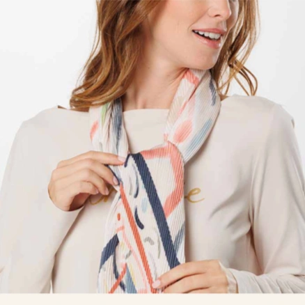 Szal wyróżnia się dekoracyjnym wzorem inspirowanym kolekcją Muse oraz spójną, stonowaną kolorystyką. Kwadratowy format daje wiele możliwości noszenia – na szyi, na ramionach, jako ozdoba torebki lub element stylizacji włosów.