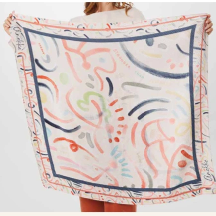 Szal wyróżnia się dekoracyjnym wzorem inspirowanym kolekcją Muse oraz spójną, stonowaną kolorystyką. Kwadratowy format daje wiele możliwości noszenia – na szyi, na ramionach, jako ozdoba torebki lub element stylizacji włosów.