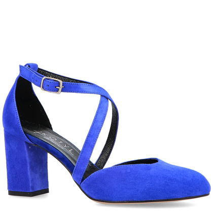 Eleganckie taneczne buty damskie ze skóry naturalnej typu nubuk w pięknym chabrowym kolorze. Producentem butów jest polska firma KOTYL. Pantofelki mają wygodny obcas w kształcie słupka, zapinane są na pasek wokół kostki.Dodatkowo krzyżowane paski na przodzie buta dobrze podtrzymują podbicie i całą stopę oraz optycznie wydłużają sylwetkę. Buty rewelacyjnie prezentują się na nodze. Klasyczny wzór w nowoczesnym wydaniu. Stabilne i wyjątkowo eleganckie. Buty doskonałe na każdą okazję sprawdzą się do wieczorowych stylizacji i podczas szaleństw na parkiecie. Pantofle wykonane w całości ze skóry naturalnej w środku i na zewnątrz. Nowość, buty wzorowane na najnowszych trendach włoskiej mody. Do butów dodajemy zapasowy komplet fleków, tak abyś mogła dłużej bezstresowo cieszyć się z użytkowania zakupionego obuwia.