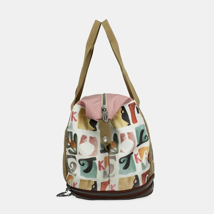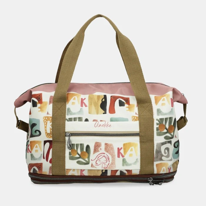 Front torby zdobi malarska grafika Anekke w odcieniach beżu, błękitu i złota – z subtelnymi haftami, tłoczeniami i metalicznymi refleksami. Złote detale, ozdobna zawieszka i logo Anekke podkreślają kobiecy charakter modelu. To torba, która łączy praktyczność z niepowtarzalnym urokiem, idealna na każdą podróż.