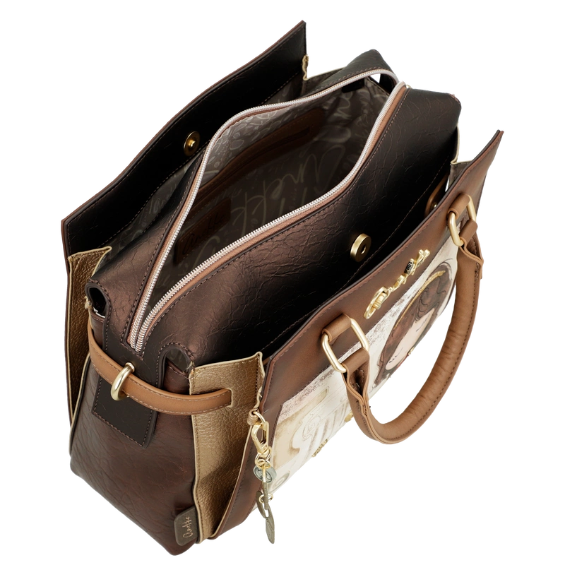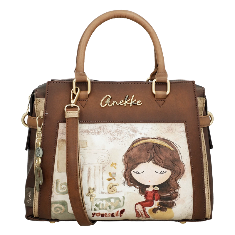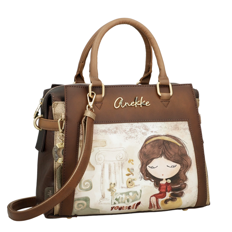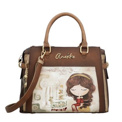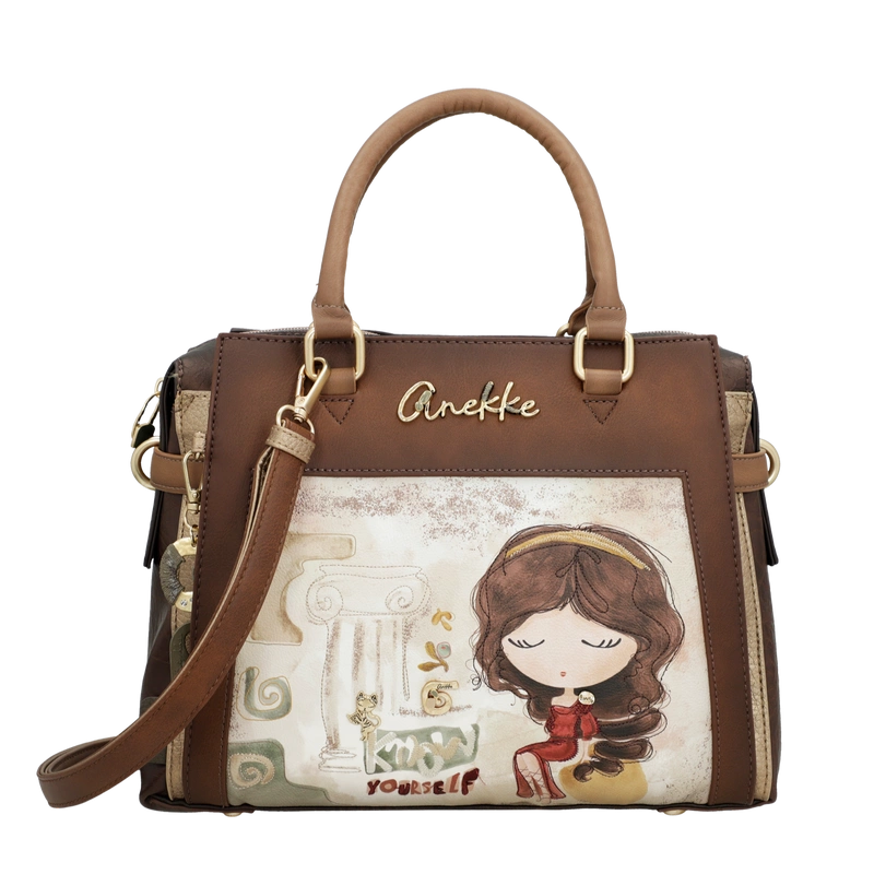Front torebki zdobi grafika Anekke w otoczeniu greckiej architektury – delikatne kolumny, złote refleksy i błękitne niebo tworzą kompozycję pełną spokoju. Starannie dobrane kolory – połączenie jasnych beży, piaskowych tonów i błękitów – sprawiają, że torebka wygląda niezwykle lekko i elegancko. Metaliczne detale i zawieszka w kształcie liścia laurowego nadają całości klasy i artystycznego charakteru.