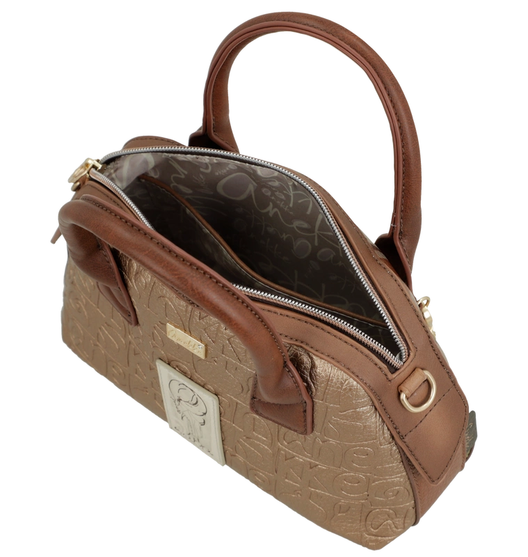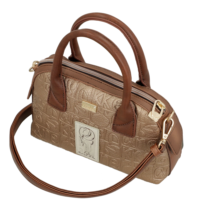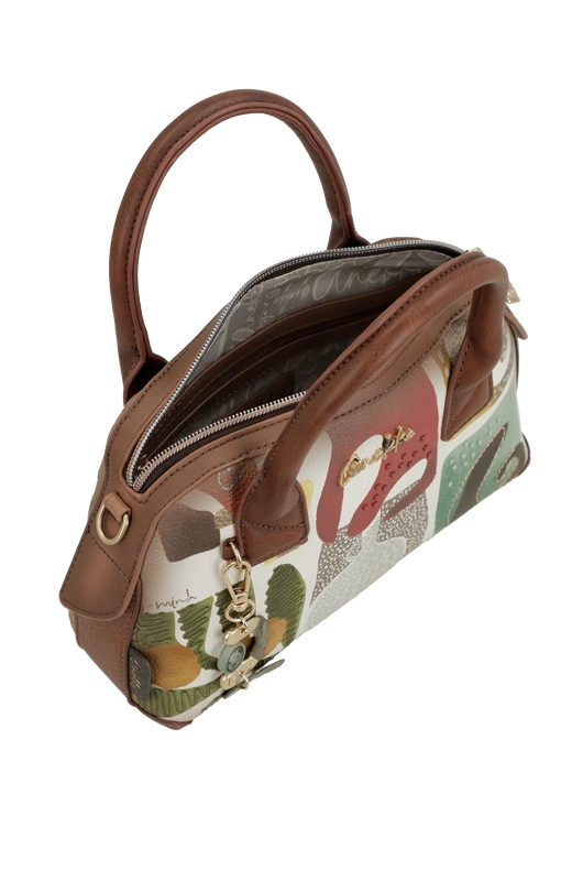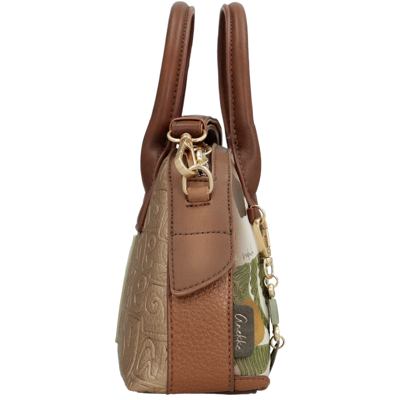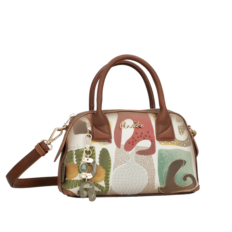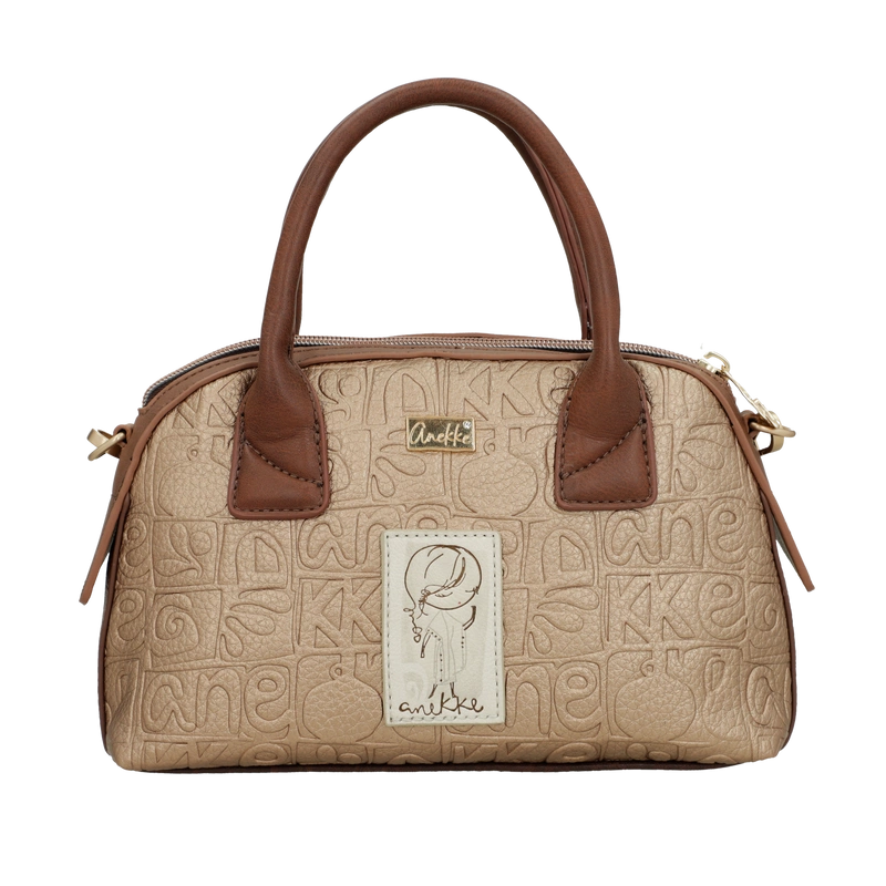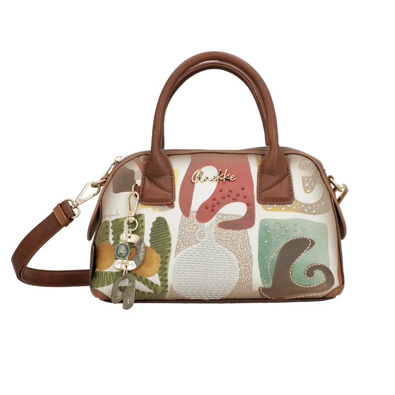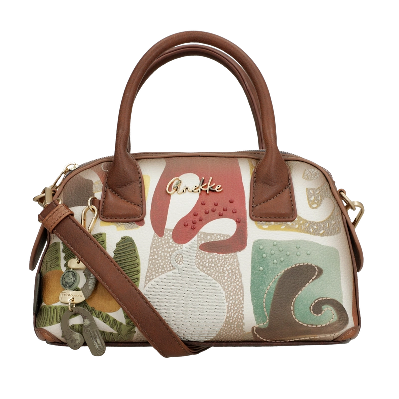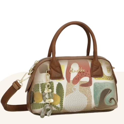 Front torebki zdobi grafika Anekke na tle antycznych wzorów – ornamenty przypominające ceramikę sprzed tysięcy lat łączą się z nowoczesnymi akcentami. Ciepłe barwy ziemi – beże, brązy i ochra – przeplatają się z delikatnymi błękitami, tworząc harmonijną kompozycję. Całość dopełniają złote detale i zawieszka w kształcie amfory, symbolizującej piękno płynące z wnętrza.