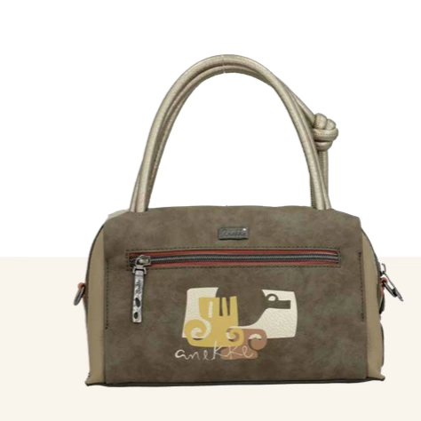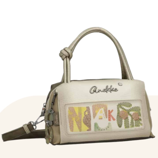 Front torebki zdobi grafika Anekke w artystycznej interpretacji greckiej amfory – pełna subtelnych barw ziemi, ochry, beżu i złocistych refleksów. Hafty, metaliczne logo oraz zawieszka w kształcie amfory nadają jej niepowtarzalnego uroku. Harmonijne połączenie tonów inspirowanych śródziemnomorską paletą kolorów przywodzi na myśl spokój, ciepło i ponadczasową elegancję.