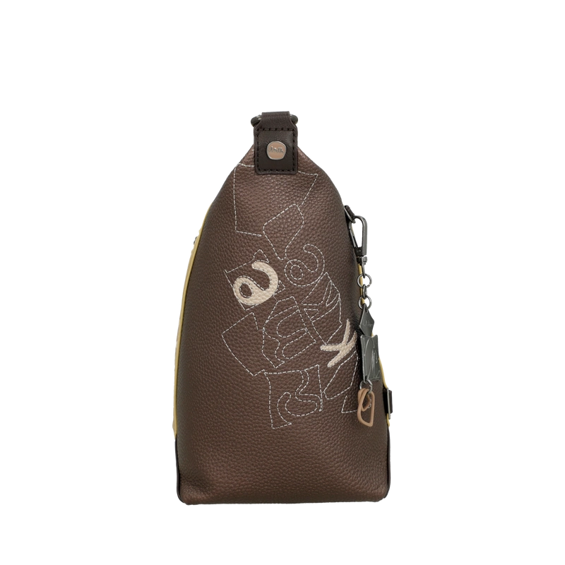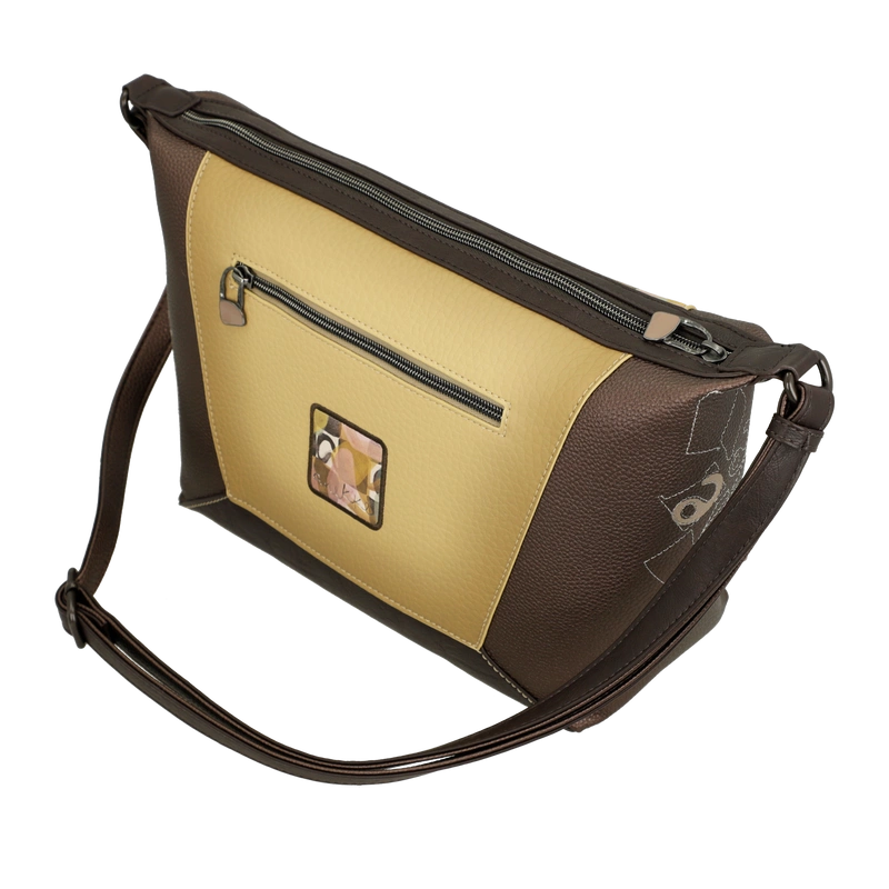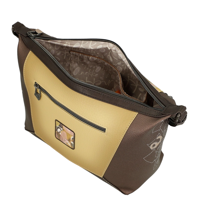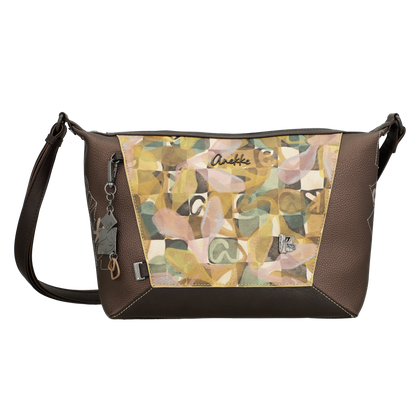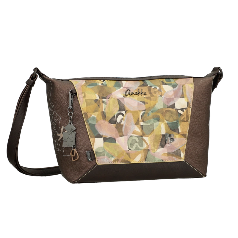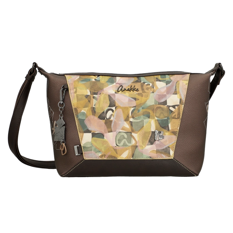Front torebki zdobi grafika Anekke w malarskim, geometrycznym stylu, utrzymana w ciepłej palecie beżu, brązu i pudrowego różu, ze złocistymi refleksami i subtelnymi haftami. Metaliczne detale oraz ozdobna zawieszka z logo Anekke dodają jej wyjątkowego charakteru. To model, który przyciąga uwagę subtelnością i klasą.