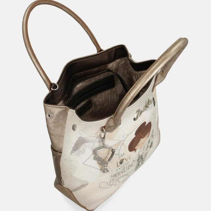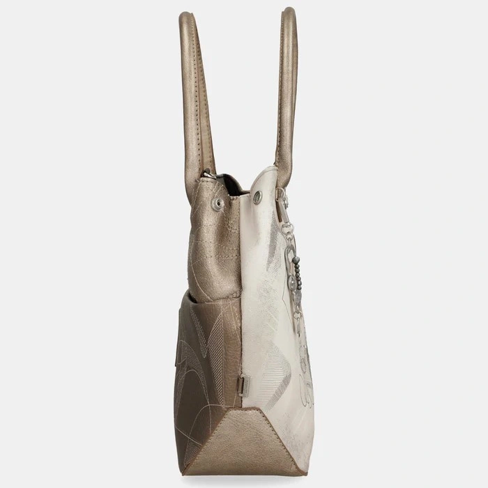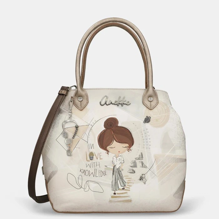 Model utrzymany jest w jasnej, stonowanej kolorystyce charakterystycznej dla linii Sophia, z delikatnymi akcentami graficznymi inspirowanymi motywami nauki, geometrii i nieba. Klasyczna forma torebki do ręki sprawia, że całość prezentuje się elegancko i lekko, doskonale uzupełniając zarówno codzienne stylizacje, jak i bardziej formalne zestawy.