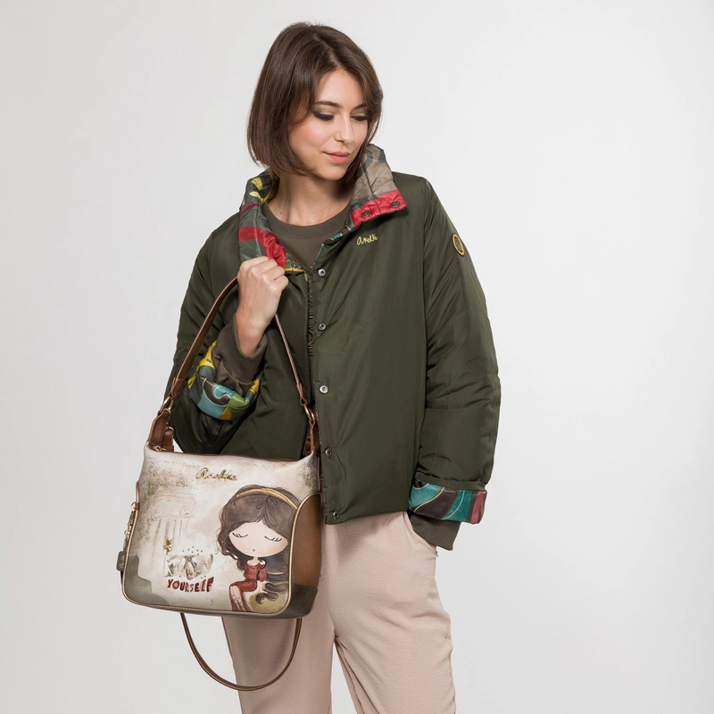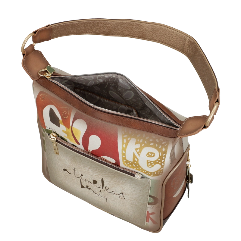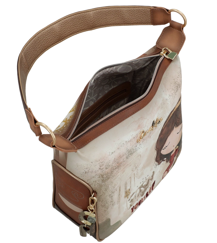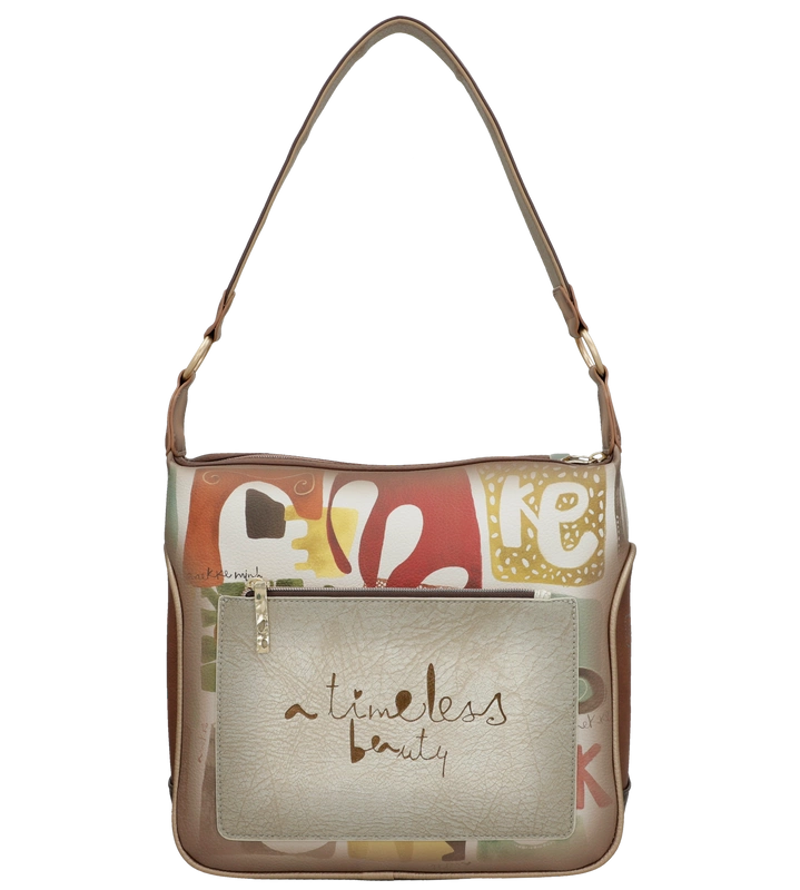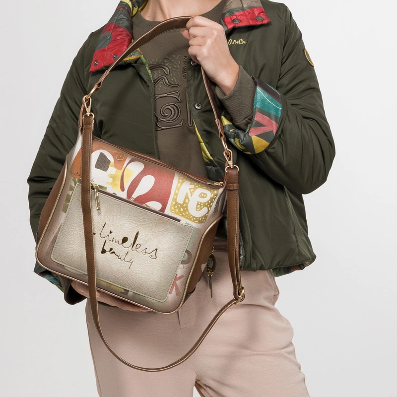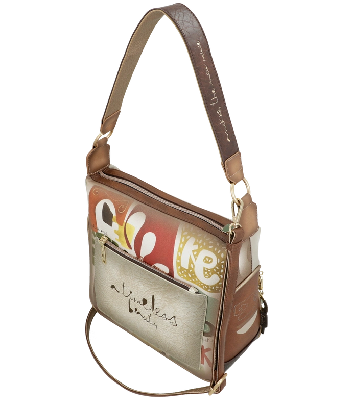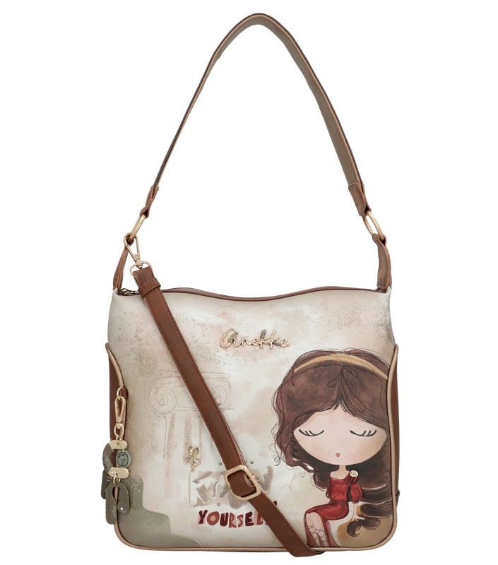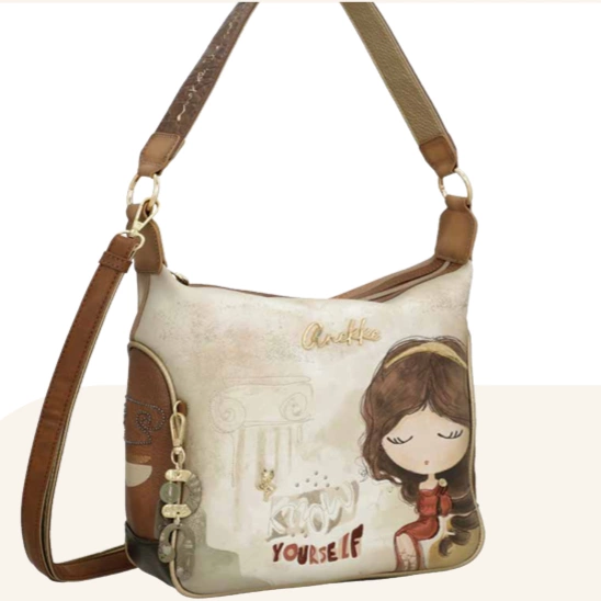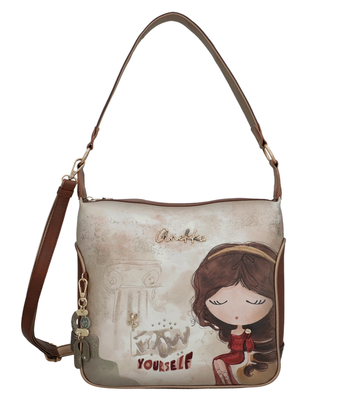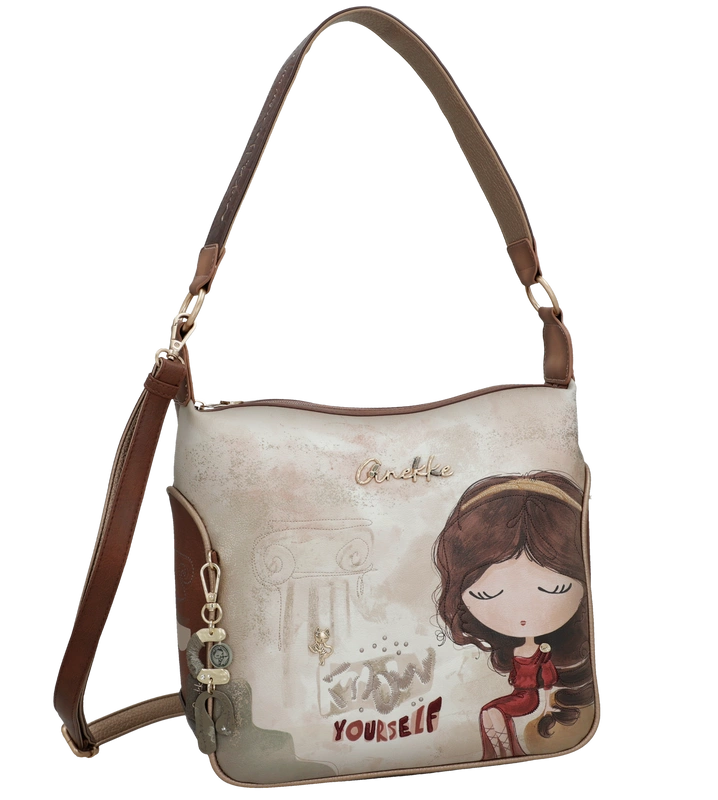 Front ozdobiony jest grafiką Anekke w antycznym otoczeniu – wśród kolumn, złotych refleksów i błękitnego nieba. Delikatne hafty, złote detale oraz zawieszka w kształcie liścia laurowego nawiązują do greckiej symboliki harmonii i mądrości. Beżowo-błękitna kolorystyka nadaje lekkości i świeżości, dzięki czemu torebka pięknie współgra zarówno z klasycznymi, jak i casualowymi stylizacjami.