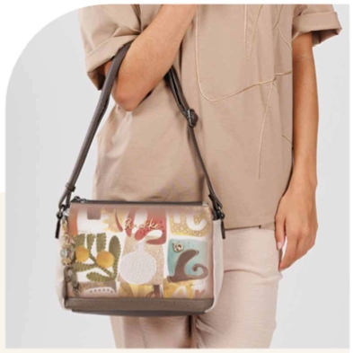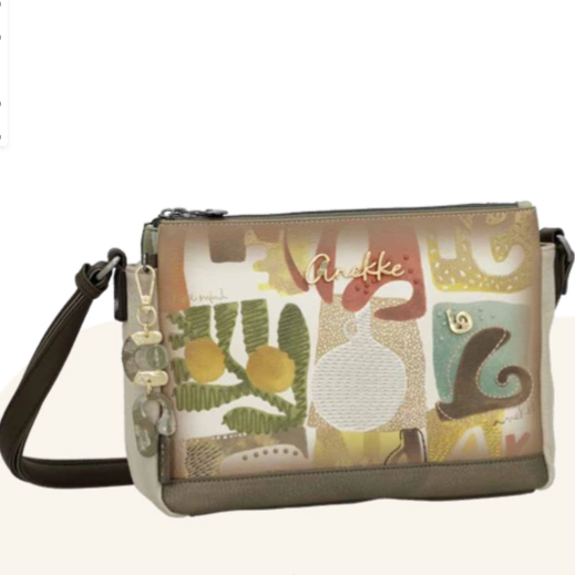 Front zdobi grafika Anekke inspirowana antyczną ceramiką – w odcieniach beżu, ochry i błękitu, z delikatnymi haftami i złotymi akcentami. Zawieszka w kształcie amfory podkreśla artystyczny charakter torebki i nadaje jej unikalnego uroku. To projekt pełen harmonii, który łączy klasykę z nowoczesnym designem.