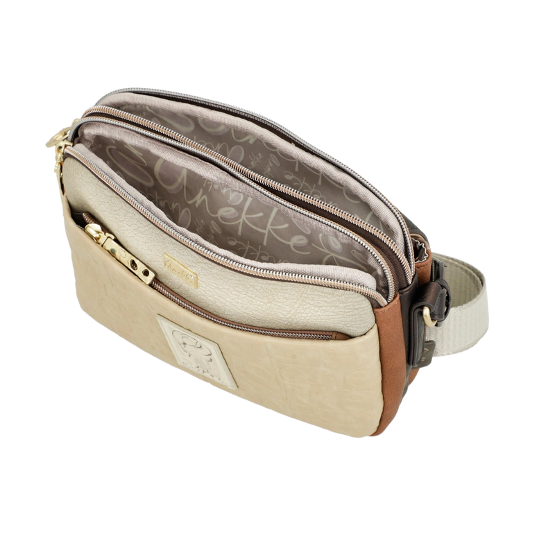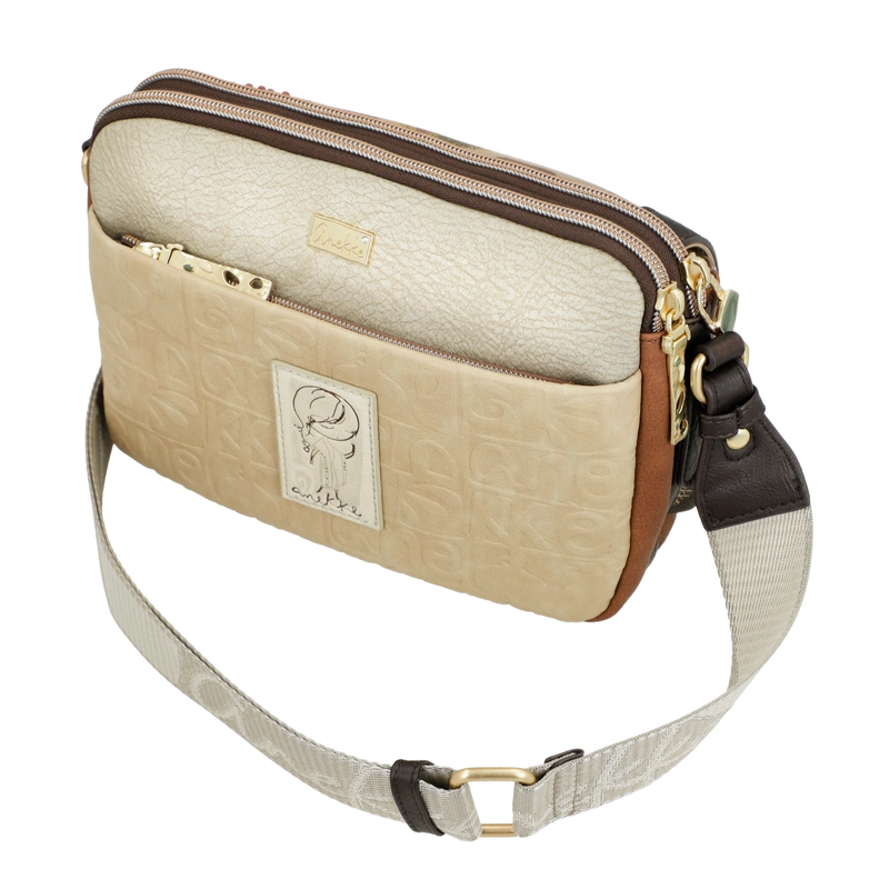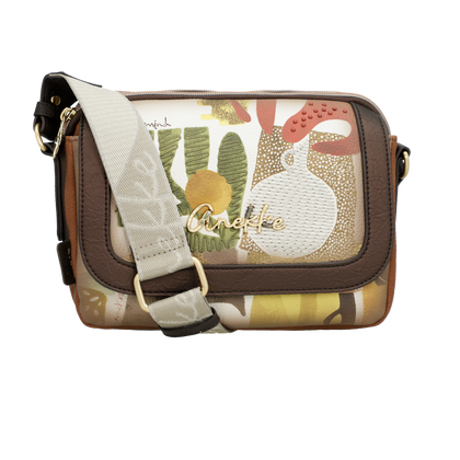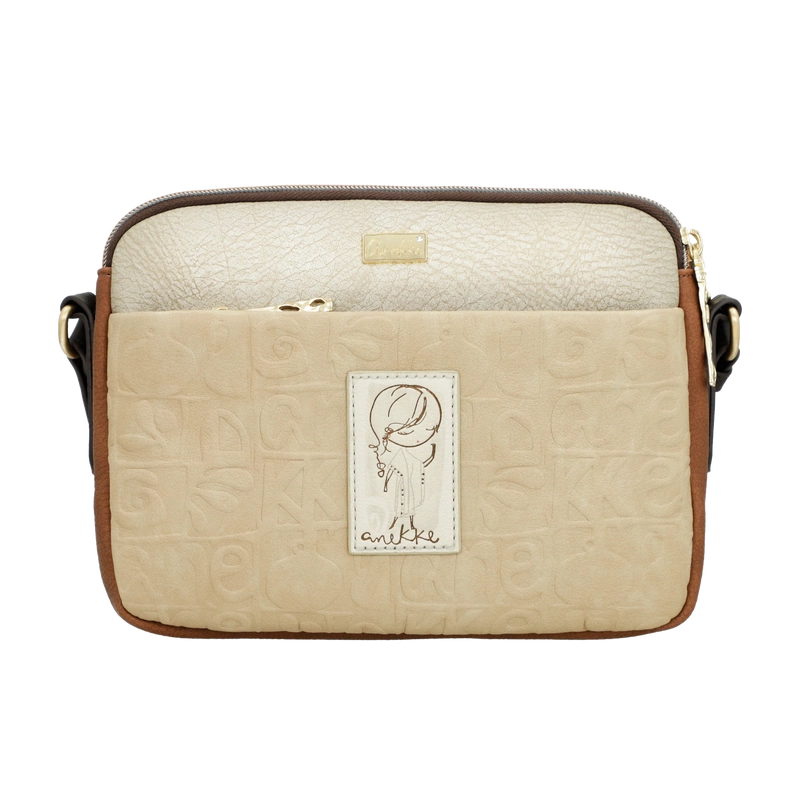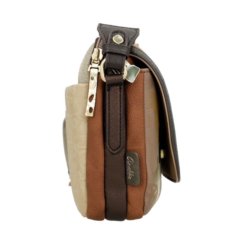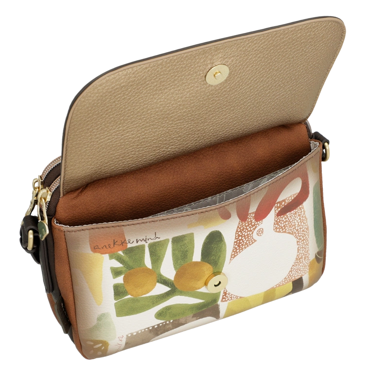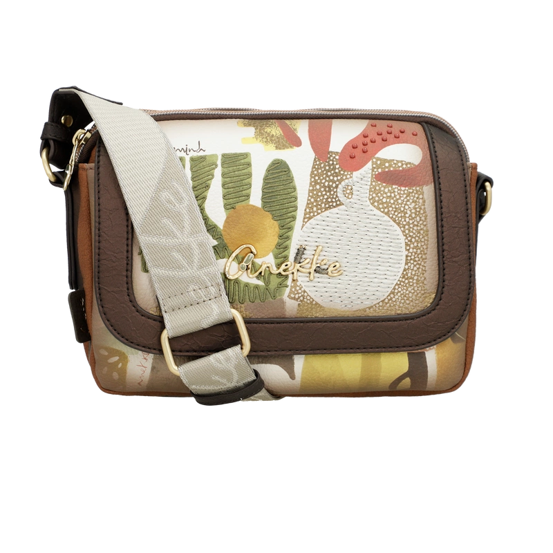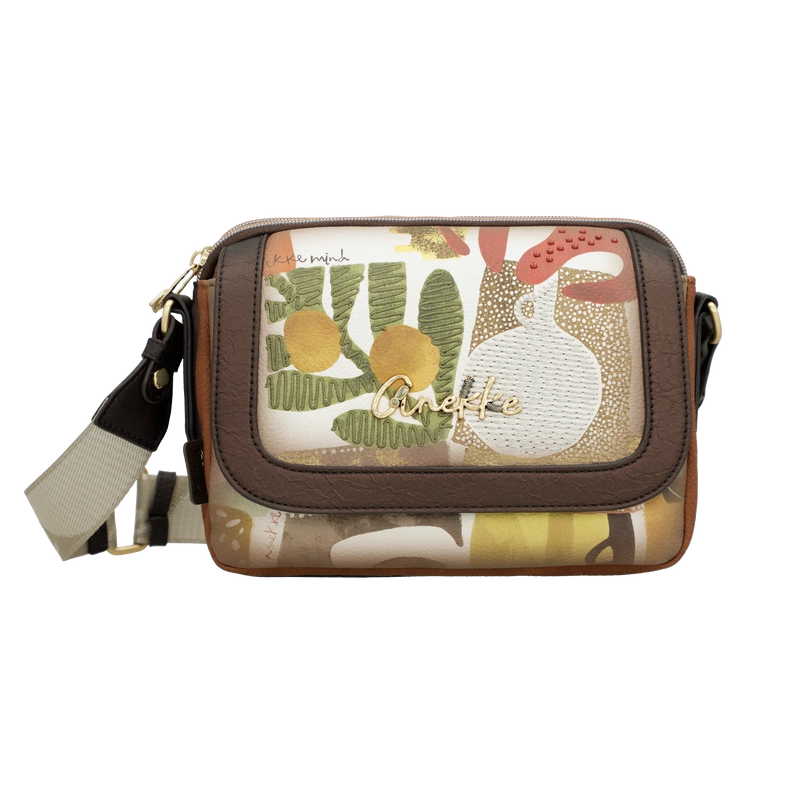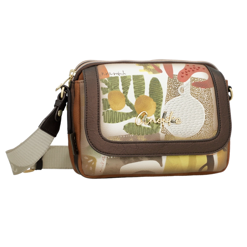 Front torebki zdobi grafika Anekke inspirowana ceramiką i antycznymi ornamentami, utrzymana w ciepłych odcieniach beżu, ochry i błękitu. Delikatne hafty, złote detale oraz zawieszka w kształcie amfory dodają jej wyjątkowego uroku. Klapka zapinana na magnetyczne zapięcie podkreśla elegancki charakter torebki, łącząc klasykę z nowoczesnością.