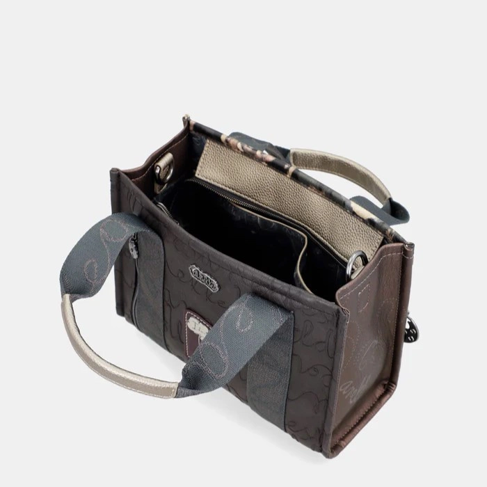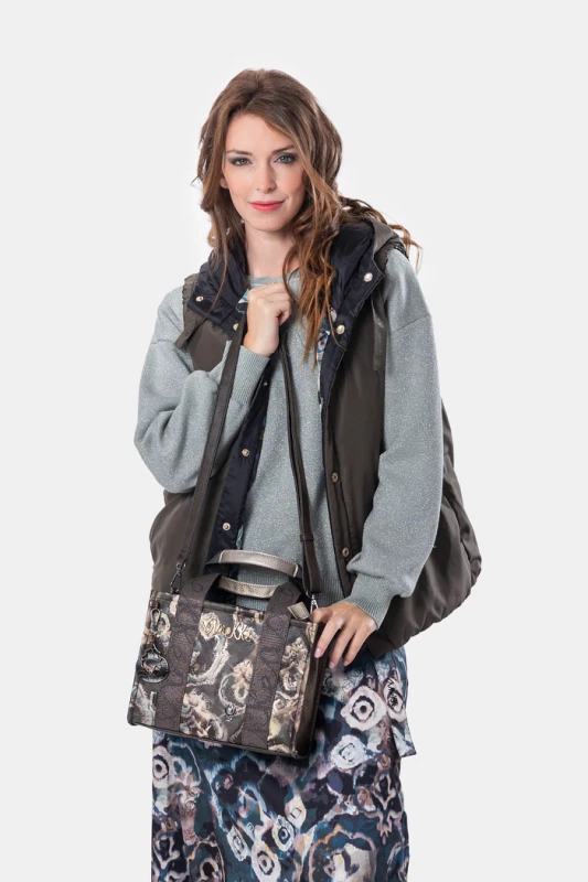 Ten model doskonale sprawdzi się jako stylowy dodatek do codziennych, ale również bardziej formalnych stylizacji. Torebka łączy kompaktowy format z funkcjonalnością i przyciąga wzrok dzięki grafikom i metalicznym akcentom, które niosą przesłanie o samoświadomości i harmonii.