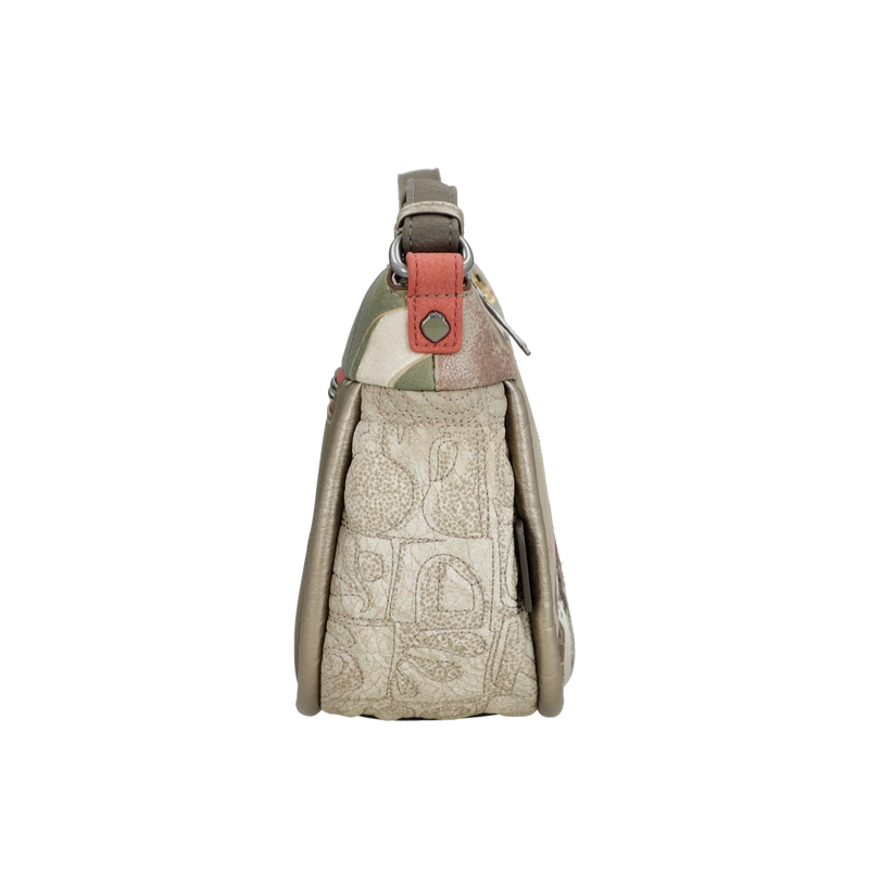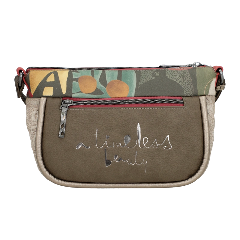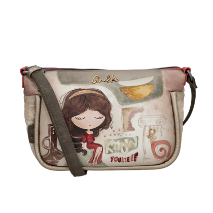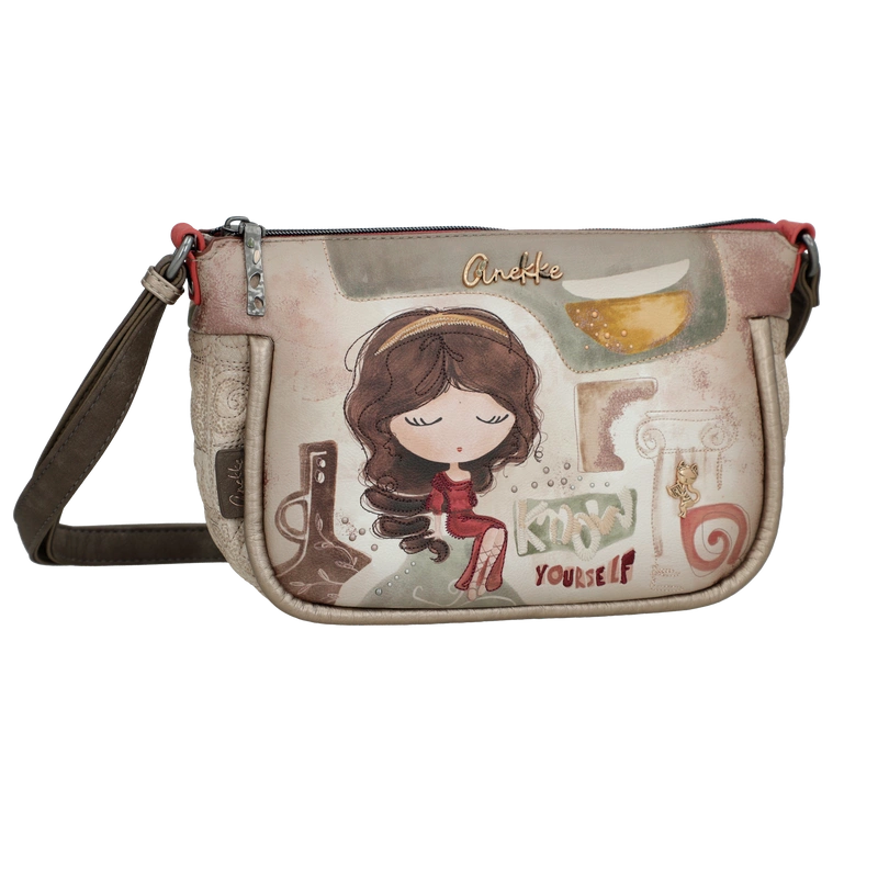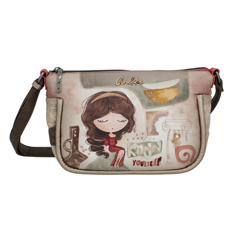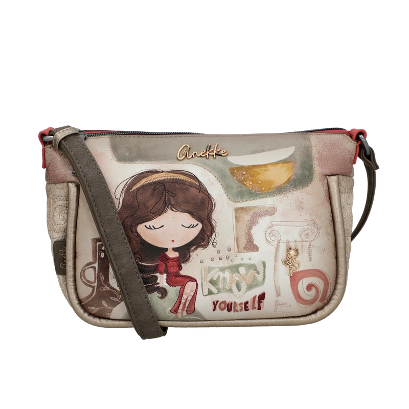 Front torebki zdobi grafika Anekke w antycznej scenerii – wśród kolumn i błękitu greckiego nieba. Ozdobne hafty, metalowe logo oraz charakterystyczna zawieszka w formie liścia laurowego tworzą wyjątkową kompozycję inspirowaną kulturą śródziemnomorską. Beżowo-błękitna kolorystyka dodaje lekkości, czyniąc tę torebkę doskonałą do każdej stylizacji.