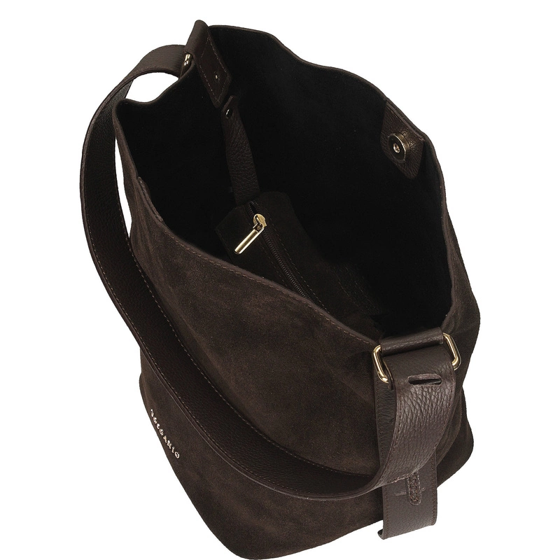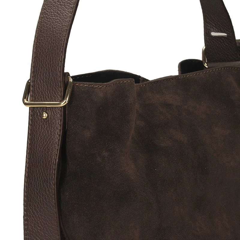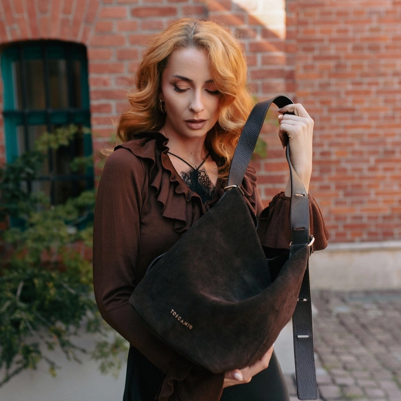 Ciemnobrązowa wersja Toscanio G100 zachwyca ciepłym odcieniem i miękką fakturą skóry zamszowej. To kolor, który doskonale komponuje się z garderobą w naturalnych barwach, a jednocześnie wprowadza nutę wyrafinowania do codziennych stylizacji. Torebka jest uniwersalna i ponadczasowa – sprawdzi się zarówno na co dzień, jak i w bardziej eleganckich zestawach.