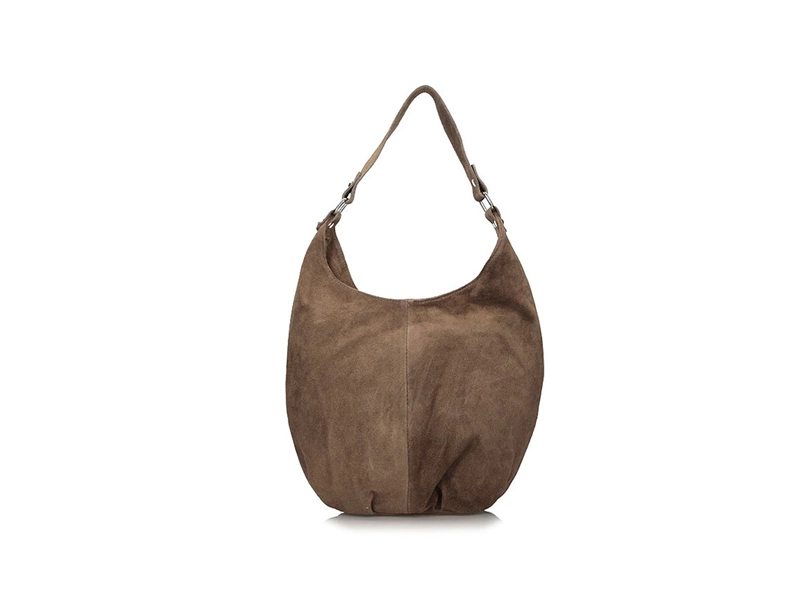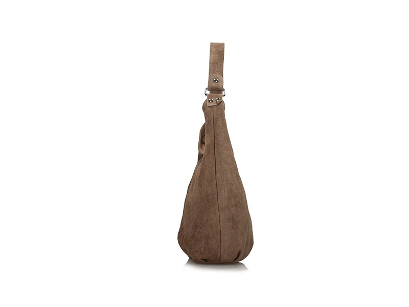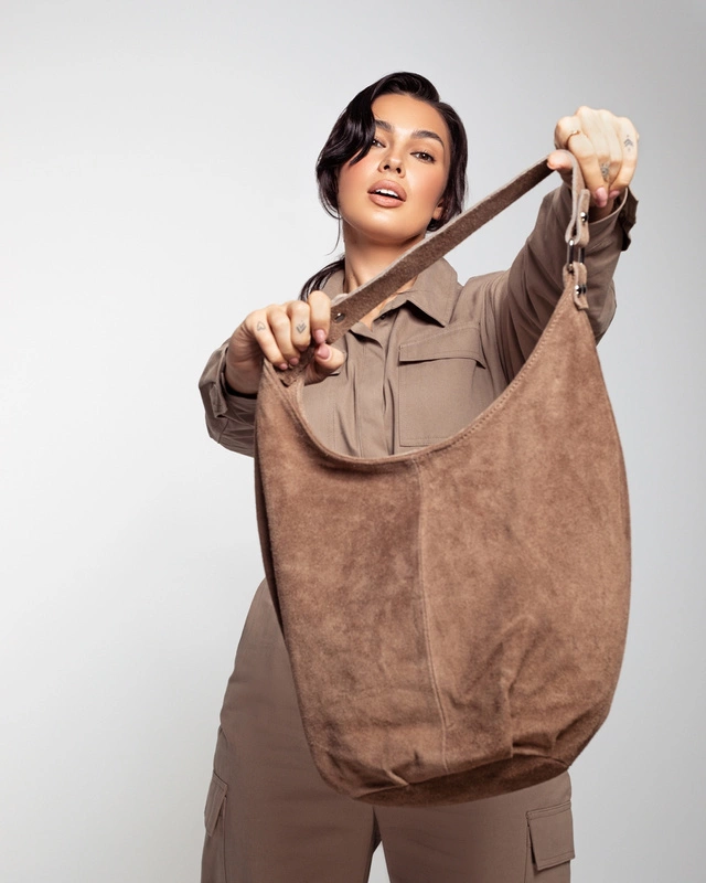 Toscanio A284 w odcieniu ciemnego beżu to wyjątkowa torebka typu worek, która łączy w sobie elegancję, komfort i nowoczesny design. Wykonana z miękkiego, przyjemnego w dotyku weluru, zachwyca delikatną strukturą i naturalnym wyglądem. To model dla kobiet, które kochają modę w codziennym, niezobowiązującym wydaniu – pełną luzu, klasy i wyrafinowanego stylu.