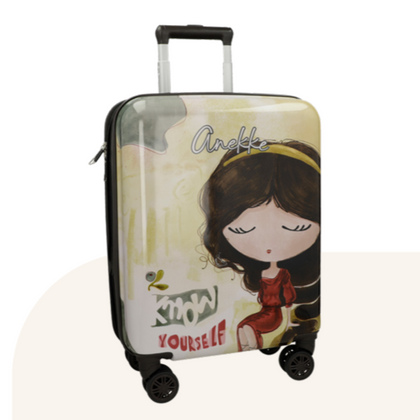 Front walizki zdobi charakterystyczna grafika Anekke w greckim klimacie – z delikatnymi zdobieniami w odcieniach beżu, błękitu i złota. Metaliczne detale, logotyp Anekke oraz motywy inspirowane antyczną architekturą nadają jej wyjątkowego, kobiecego uroku. To nie tylko bagaż, ale prawdziwy element stylizacji każdej podróżniczki.