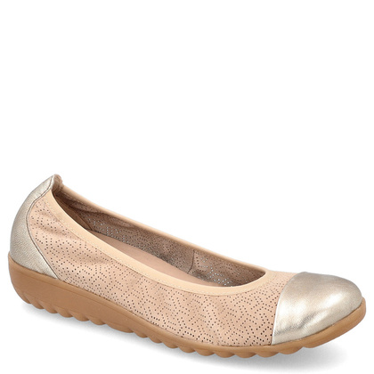 Poszukujesz wygodnego obuwia, które będzie ci towarzyszyć przez całodniowy maraton obowiązków? Jeśli tak to prezentowane przez nas skórzane baleriny od renomowanego producenta  - CAPRICE- mogą okazać się idealną propozycją właśnie dla Ciebie! Damskie baleriny wykonano z najwyższej jakości naturalnej skóry. Obcas typu koturn o 3 -centymetrowej wysokości nie tylko jest stabilny lecz dodaje nam kilku centymetrów do wzrostu. W balerinach zastosowano wyjmowaną wkładkę AIRMOTION, która zapewnia komfortową cyrkulację powietrza oraz amortyzację podczas użytkowania. AIRMOTION zapobiega zmęczeniu oraz zapewnia przyjemny klimat wewnątrz buta. Beżowa kolorystyka przełamana złotymi elementami sprawdzi się doskonale jako dopełnienie outfitu!