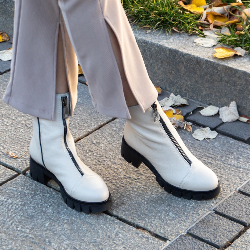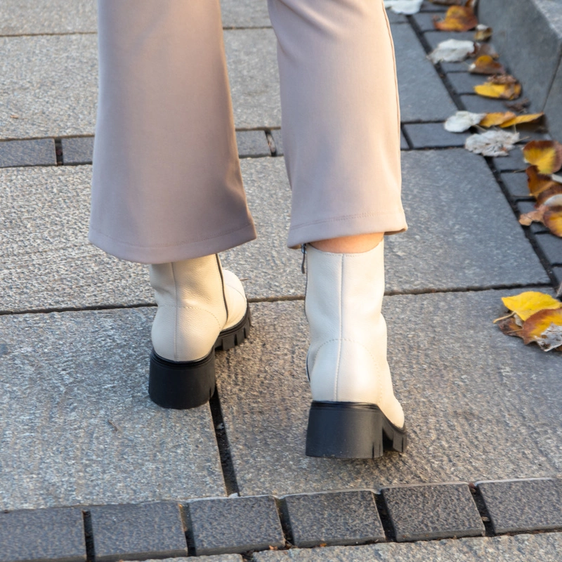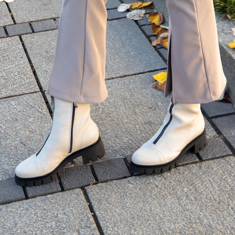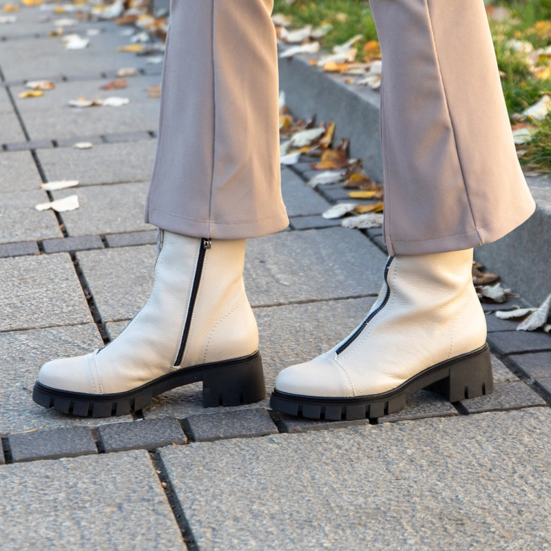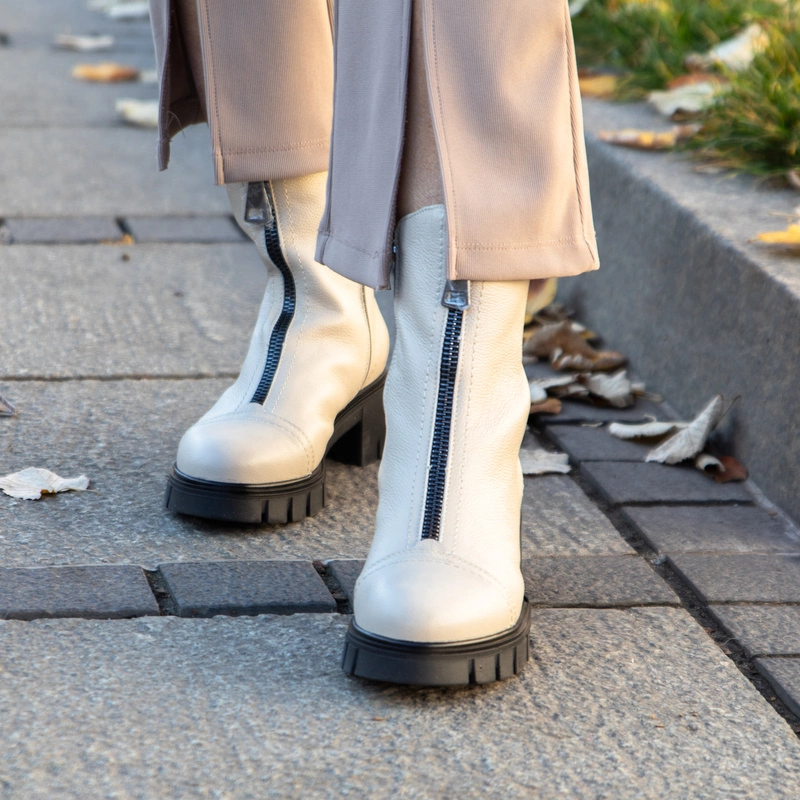 Wygodne botki ze skóry z kolekcji polskiej marki SIMEN, która słynie z produkcji wysokiej jakości obuwia o niestandardowym kroju. Botki na traperze powstały z wysokiej jakości skóry naturalnej licowej w klasycznym beżowym kolorze. Gruba podeszwa i szeroki, stabilny obcas to gwarancja pełnego komfortu. Posiadają ozdobę na przodzie buta w postaci suwaka, który się nie rozsuwa. Zapinane na suwak od wewnętrznej strony buta. W tym modelu zastosowano wkładkę wykonaną z lekkiej tkaniny ocieplającej, która podczas codziennego użytkowania zapewnia komfort i wygodę.