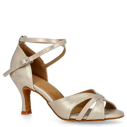 Szukasz wygodnych, a jednocześnie efektownych butów na taneczną imprezę? Sandałki z najnowszej kolekcji TYMOTEO LOVE to profesjonalne taneczne buty! Zgrabne sandałki z miękką elastyczną podeszwą wykończoną od spodu skórą welurową doskonale łączą wygodę i efektowny wygląd. Cholewkę buta opracowano tak, by jak najlepiej trzymała stopę, a paseczki wokół kostki gwarantują stabilne kroki na parkiecie. Odkryty przód i zakryta pięta połączone ze skrzyżowanymi paskami to wzór charakterystyczny dla obuwia tanecznego. Buty są wyjątkowo wygodne i doskonale sprawdzą się podczas wielogodzinnej zabawy na parkiecie lub treningach tańca latynoskiego. W sandałkach zastosowano sprawdzony obcas o wysokości 7,5 cm, szpilka latynoska typu flare dodaje sylwetce lekkości, a przy tym jest bardzo stabilna. Paski trzymające stopę ułożone są krzyżowo, dzięki temu but podkreśla jej zgrabną linię nogi i dodaje butom wdzięku. Wnętrze buta także zostało wykonane z miękkiego materiału, zapewnia więc doskonałą cyrkulację powietrza. Buty wykonane z metalizowanej skóry naturalnej połyskującej w odcieniu platynowego złota.