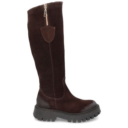 Kozaki wykonane zostały z wysokogatunkowej skóry naturalnej zamszowej, odpornej na zagniecenia i pięknie prezentującej się w każdym świetle. Ciepły, czekoladowy kolor dodaje im ponadczasowego uroku, a delikatna faktura skóry sprawia, że są niezwykle miękkie w dotyku. Subtelne przeszycia podkreślają jakość wykonania i dbałość o każdy szczegół, charakterystyczną dla marki TYMOTEO.