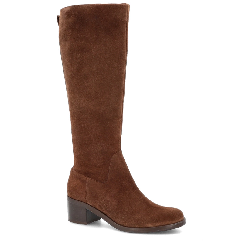 Zamszowe kozaki na niskim obcasie Kotyl 1389 czekoladowe – elegancja w codziennym wydaniu