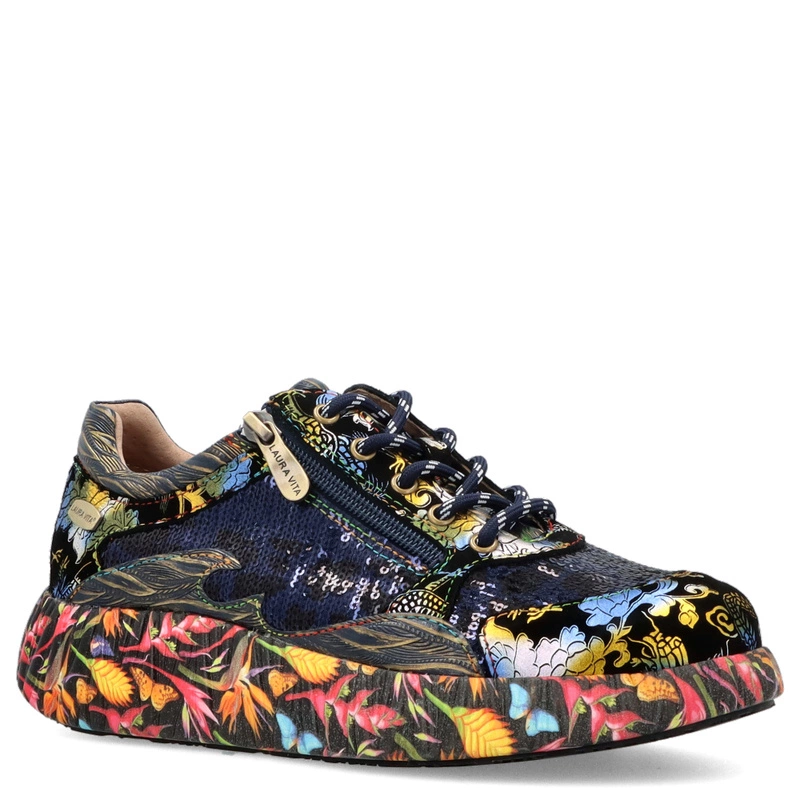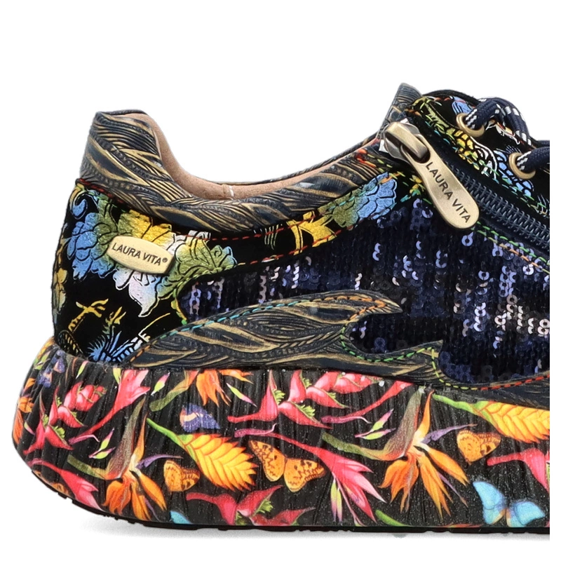 Granatowe sneakersy LAURA VITA NIKITO 09 to obuwie, które łączy komfort sportowych butów z unikalnym, artystycznym designem. Wykonane z wysokiej jakości materiałów, zachwycają bogatym zdobieniem, połyskującymi cekinami i intensywnymi kolorami. Każdy detal został dopracowany tak, aby tworzyć efektowną, niepowtarzalną całość, która przyciąga spojrzenia.