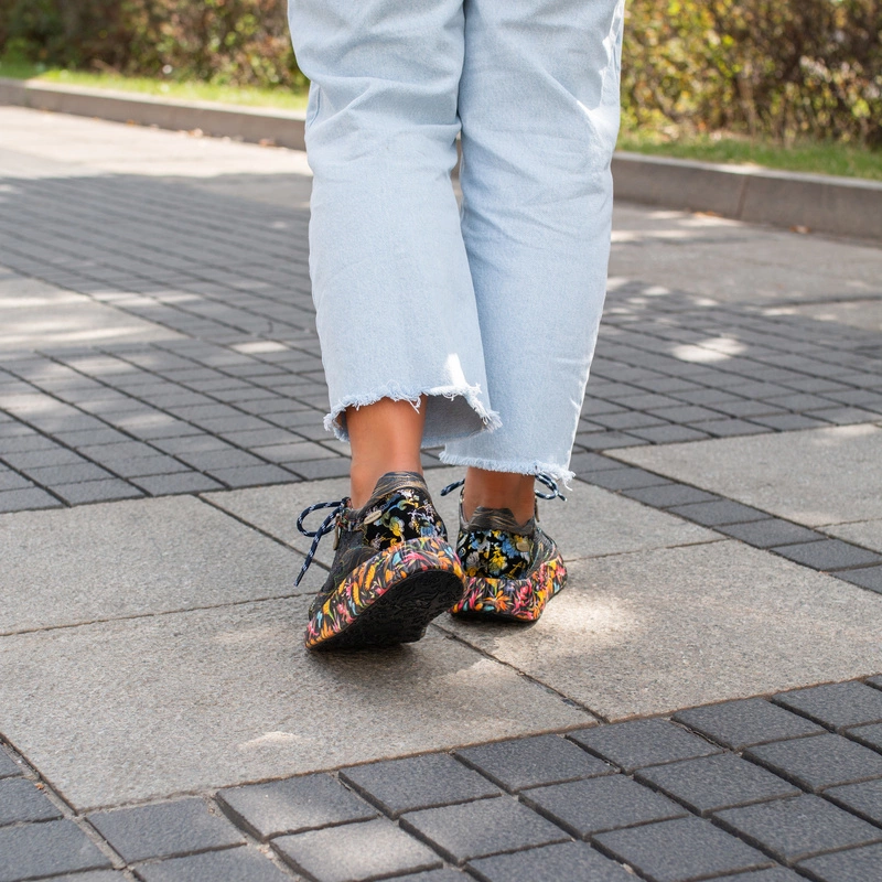 Model NIKITO 09 wyróżnia się platformową podeszwą pokrytą kolorowym, kwiatowym wzorem, która nie tylko dodaje centymetrów wzrostu, ale również nadaje butom niebanalnego charakteru. Dla wygody użytkowania buty wyposażono w sznurowanie oraz praktyczny boczny zamek, dzięki czemu zakładanie i dopasowanie są szybkie i komfortowe.