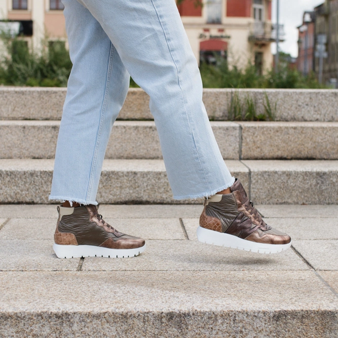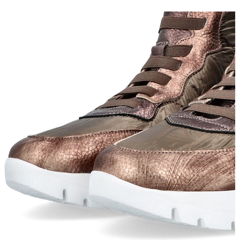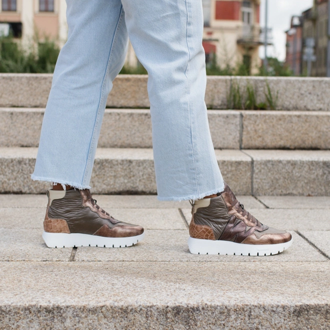 Hiszpańskie sneakersy premium Wonders A-2493 to idealne połączenie mody i funkcjonalności. Wykonane z wysokiej jakości materiałów, zachwycają połyskującym złotym wykończeniem, które subtelnie odbija światło, tworząc efekt luksusu w codziennej odsłonie. Wysoka konstrukcja za kostkę dodaje im nowoczesnego charakteru i zapewnia lepsze wsparcie dla stopy.